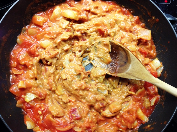 - Add the tomatoes, stir to combine then add the peanut butter (and coriander, if using), stirring it in until smooth.